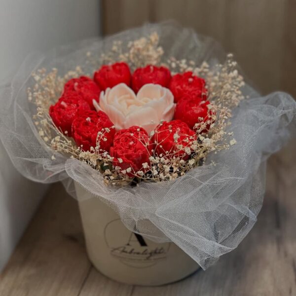 Un buchet spectaculos în tonuri intense de roșu și alb, completat de accente diafane din voal și flori uscate. O alegere sofisticată pentru momente memorabile, încărcate de emoție și rafinament.
